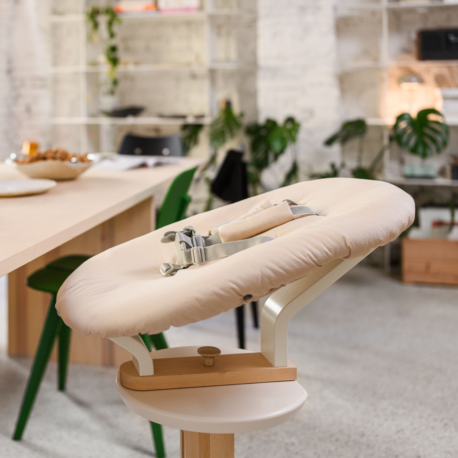 Vključuje mehko, ergonomsko otroško lupinico s tkaninskim prevlekom iz 100 % bombaža, ki se varno pritrdi na otroški stol, kar omogoča, da so tudi najmlajši dojenčki del družinskih trenutkov. Primerna je za uporabo od rojstva do 6 mesecev.